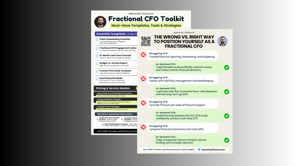 The Wrong vs. Right Way to Position Yourself as a Fractional CFO + Fractional CFO Toolkit€0+€0+https://schema.org/InStockeurAleksandar StojanovicAleksandar StojanovicThis bundle contains...The Wrong vs. Right Way to Position Yourself as a Fractional CFO0.0 (0)Qty: 1€0Fractional CFO Toolkit0.0 (0)Qty: 1€0Name a fair price:€QuantityI want this!4 downloadsAdd to wishlist New wishlistShareShare on XShare on Facebook Copy linkCopy product URL