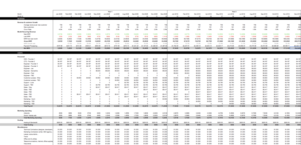 Project ARR, MRR, churn rate, customer acquisition, and burn rate across two full years